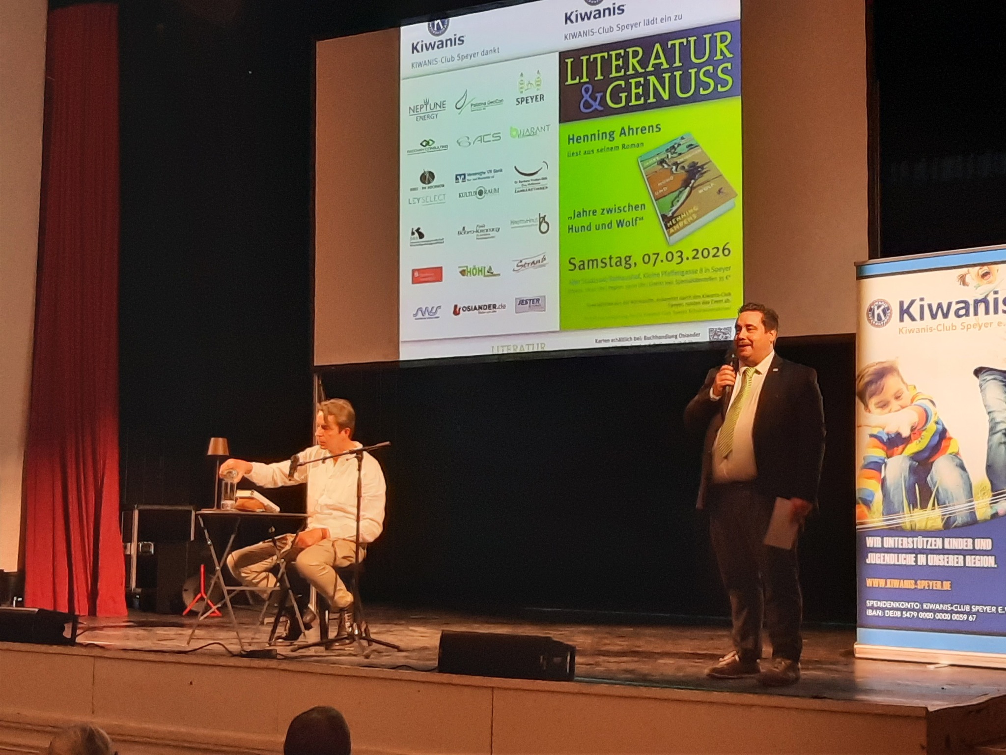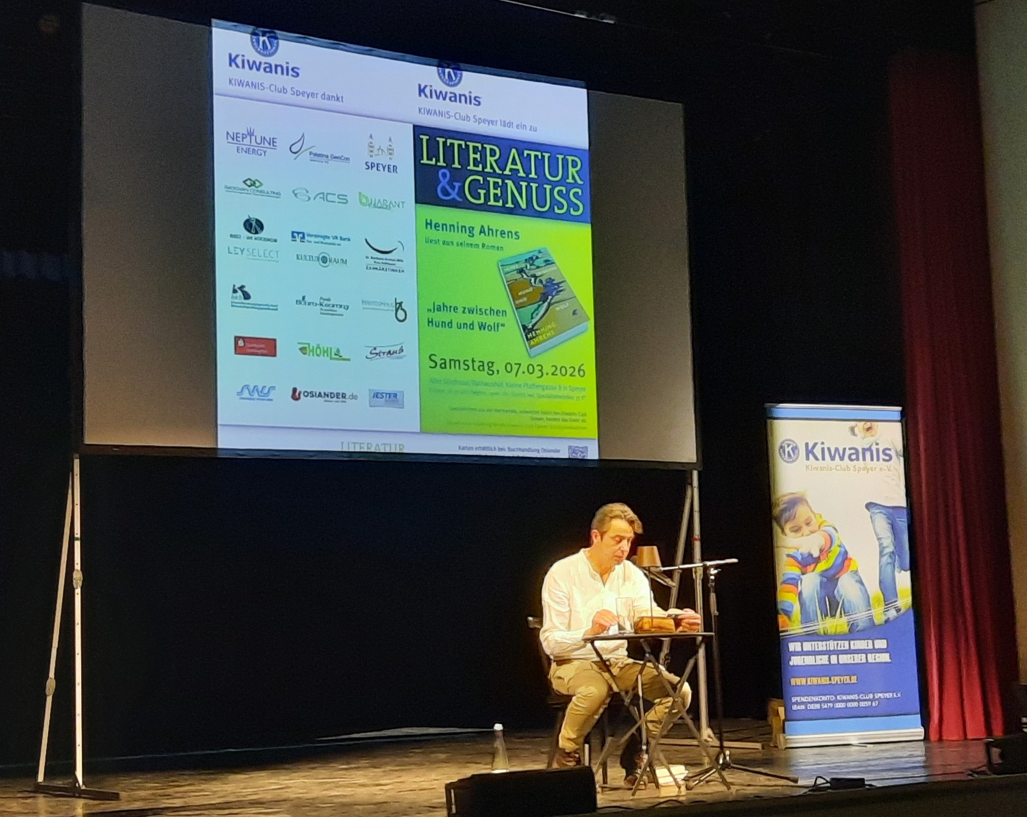 Am Samstagabend füllte sich der Alte Stadtsaal mit über 100 Zuhörern, die unserer Einladung zu „Kiwanis Literatur & Genuss“ gefolgt waren. Henning Ahrens war aus Frankfurt angereist, las aus seinem Buch „Jahre zwischen Hund und Wolf“ und nahm das Publikum mit auf eine Reise in die Normandie, wo es Bekanntschaft mit Hardy Espen, dessen Partnerin Aîné und weiteren Protagonisten machte. Angelehnt an den Schauplatz des Romans servierten wir den Besuchern in der Pause einen französischen Spezialitäten-Teller, der reichlich mit Leckerbissen wie Rillettes, Taboulé und Camembert belegt war. Nach der Lesung signierte Henning Ahrens noch einige seiner Bücher, die wir an unserem Büchertisch verkauften. Wie immer fließt der Reinerlös des Abends in unser Schulranzenprojekt, bei dem wir in diesem Jahr wieder 87 Schulranzen und -rucksäcke inkl. Inhalt stiften werden. Ein dickes Dankeschön geht daher an alle Ticketkäufer und an unsere Sponsoren!